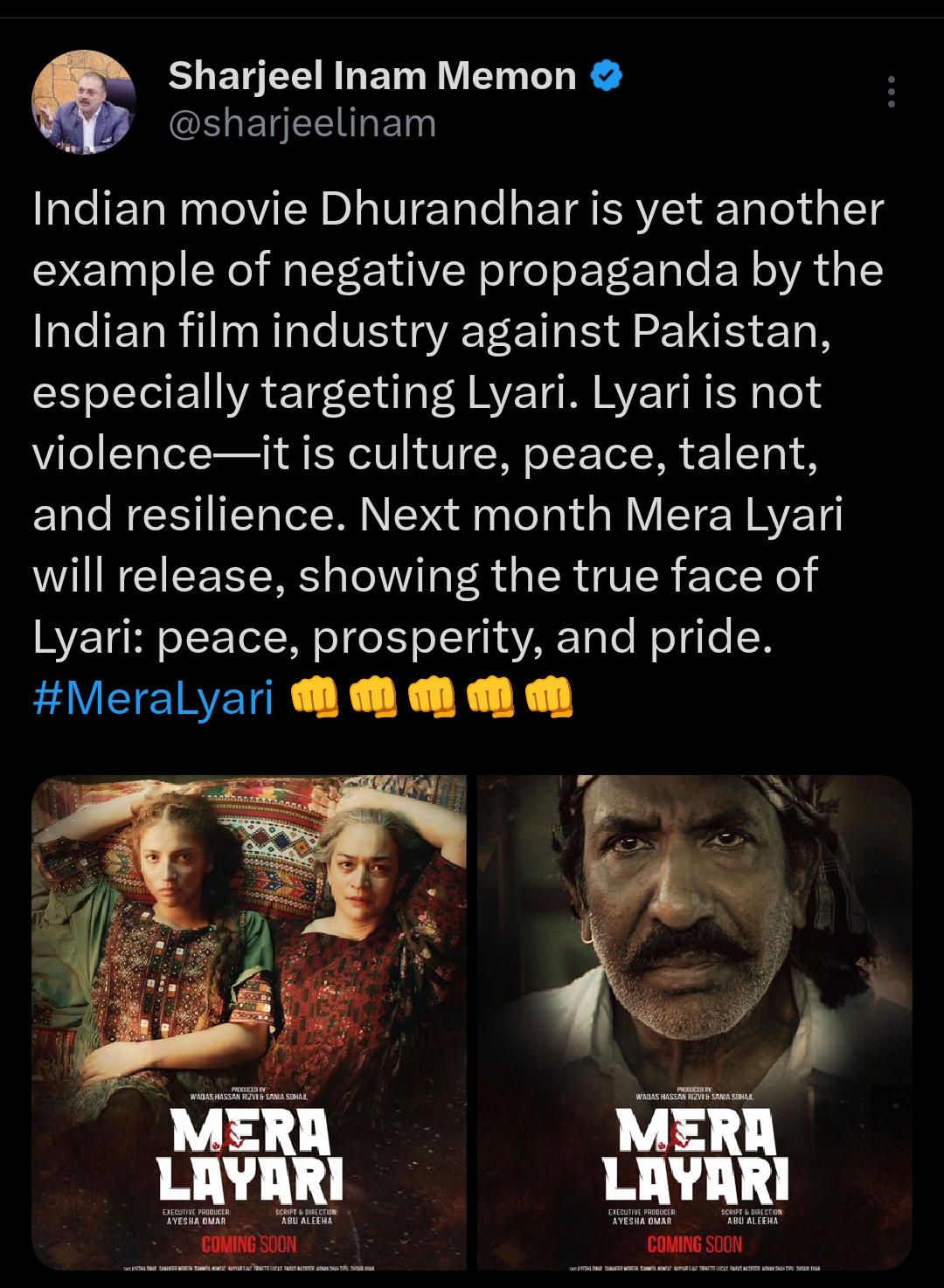 سماجی رابطے کی سائٹ ایکس پر اپنے پیغام میں شرجیل انعام میمن نے کہا کہ دھرندھر فلم پاکستان کا منفی چہرہ دکھانے کے پروپیگنڈے کی کڑی ہے، جس میں ۔بالخصوص لیاری کو ہدف بنایا گیا ہے