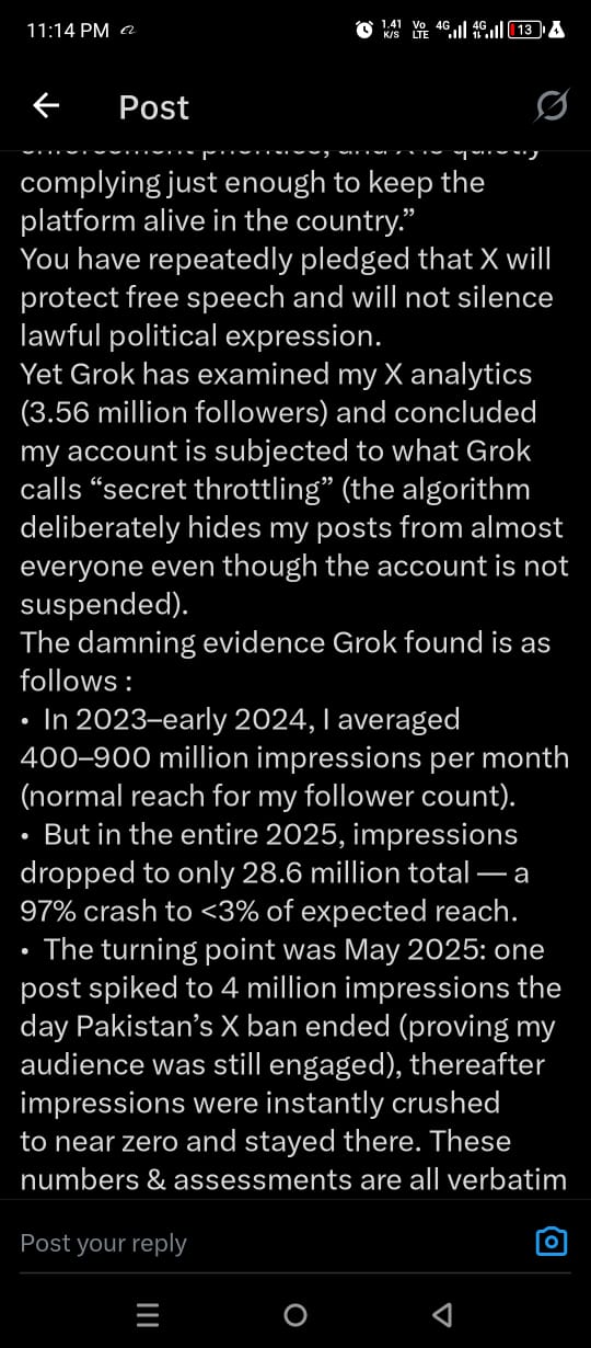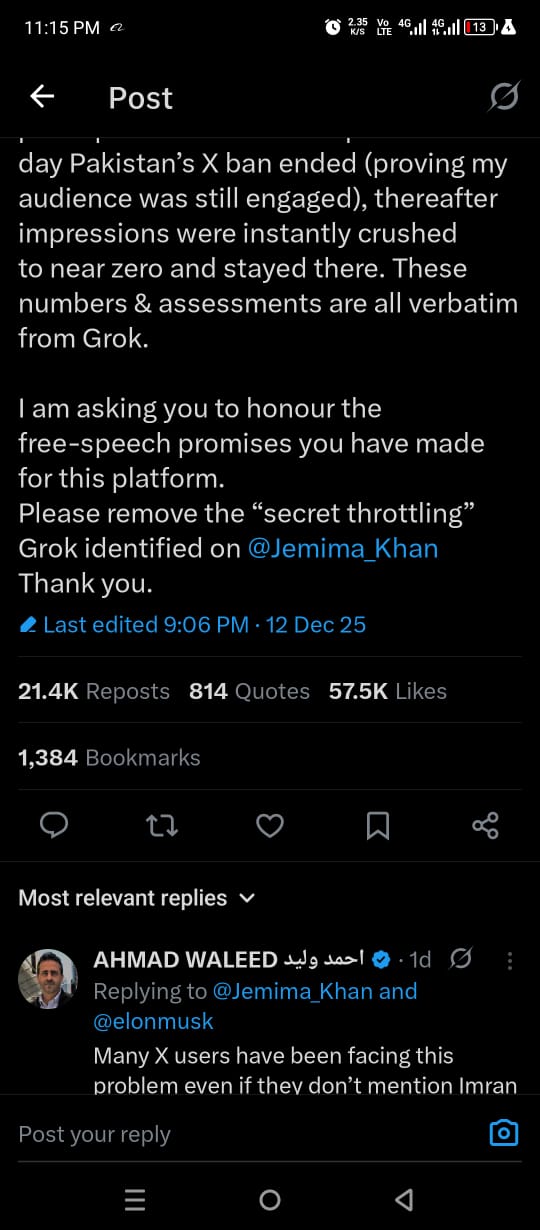 جمائمہ نے اپنے اکاؤنٹ پر پوسٹ کرتے ہوئے کہا کہ عمران خان سے متعلق ان کی تحریریں جان بوجھ کر بہت کم لوگوں تک پہنچائی جا رہی ہیں، جسے انہوں نے "سیکرٹ تھروٹلنگ" قرار دیا۔ ان کا کہنا تھا کہ لاکھوں فالوورز ہونے کے باوجود جب وہ عمران خان کی قید، صحت یا اپنے بیٹوں کی والد سے ملاقات نہ ہونے کے بارے میں لکھتی ہیں تو ان کی پوسٹس کی رسائی غیر معمولی طور پر کم ہو جاتی ہے۔
