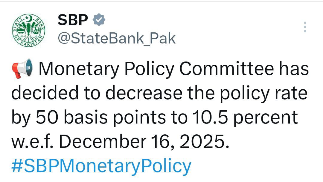 اسٹیٹ بنک نے سوشل میڈیا پر بیان جاری کرتے ہوئے نئے مانیٹری پالیسی کا اعلان کیا ہے۔ جس کے تحت شرح سود میں 50 بیسز پوائینٹس کی کمی کا اعلان کیا گیا۔